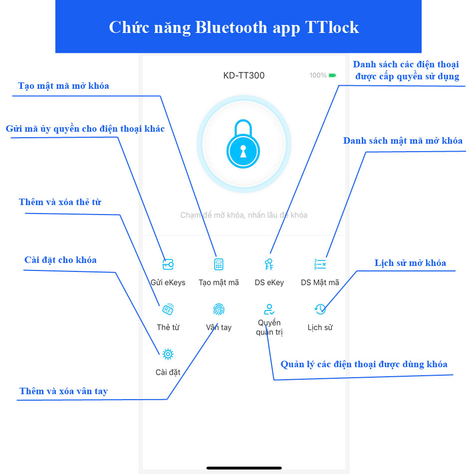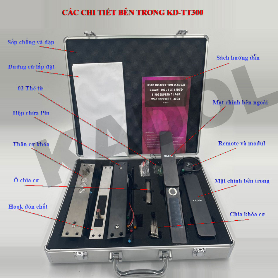 Phương thức mở khóa: Khóa KD-TT300 với Mở khóa bằng vân tay chống thấm nước hai mặt, Mở khóa ứng dụng Bluetooth TTLOCK hai mặt, Mở khóa WIFI hai mặt (Tùy chọn), Mở khóa bằng mật mã hai mặt, Mở khóa bằng thẻ hai mặt, Cơ hai mặt Mở khóa bằng phím