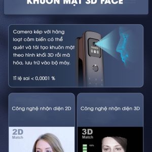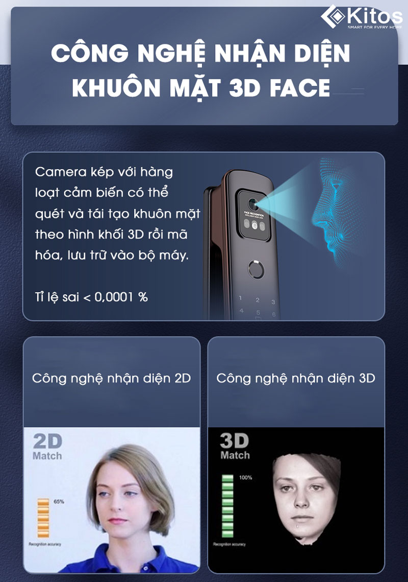 Kitos 3D Face X ứng dụng công nghệ nhận diện 3D Face tân tiến nhất. Camera kép với hàng loạt cảm biến để có thể quét và tái tạo khuôn mặt theo hình khối 3D rồi mã hóa, giúp bảo mật tuyệt đối. So với công nghệ 2D chụp ảnh rồi lưu trữ trong bộ nhớ, sau đó xác nhận lại khuôn mặt được quét thì độ bảo mật công nghệ 3D vượt trội hơn hẳn. Tốc độ nhận diện chỉ trong tíc tắc là có thể mở cửa.