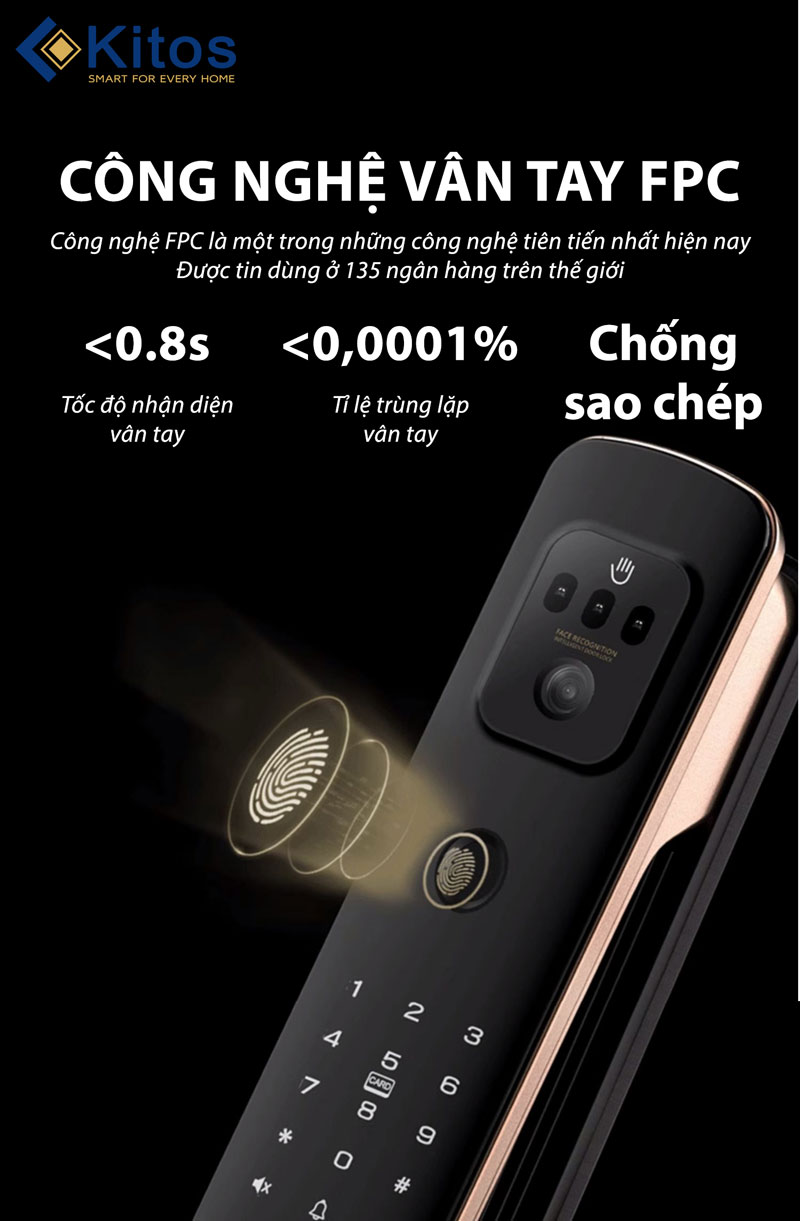 Giống như các dòng sản phẩm khác của Kitos, mã sản phẩm 3D Face X sử dụng công nghệ nhận diện vân tay FPC Thụy Điển. Công nghệ này chỉ nhận diện ở trên cơ thể sống dựa trên 3 cảm biến là nhiệt độ, áp suất và điện dung. Chính vì vậy mà các trường hợp làm giả, sao chép vân tay đều không thể qua mặt được.