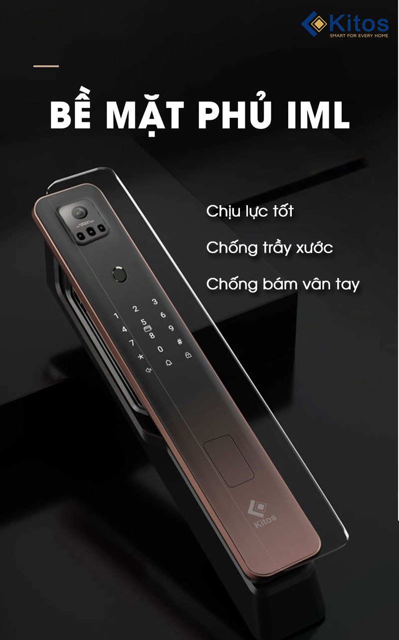 Một điểm cộng của dòng Kitos Face X là công nghệ sơn phủ IML trên bề mặt khóa. Thông thường khi chúng ta chạm tay vào khóa sẽ để lại vết bám trên bề mặt. Nhưng với công nghệ phủ IML với chức năng chống bám bụi bẩn, chống trầy xước bạn hoàn toàn có thể chạm lên bề mặt mà không sợ bám lại vết bẩn. Điều này giúp cho bộ khóa của gia đình bạn luôn được như mới sau một thời gian dài sử dụng.