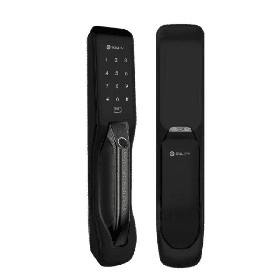 - Khóa cửa thông minh Solity GP-3000BK sử dụng kết hợp 5 tính năng mở khóa vân tay, mã số, thẻ từ, chìa khóa thông thường và app trên điện thoại.