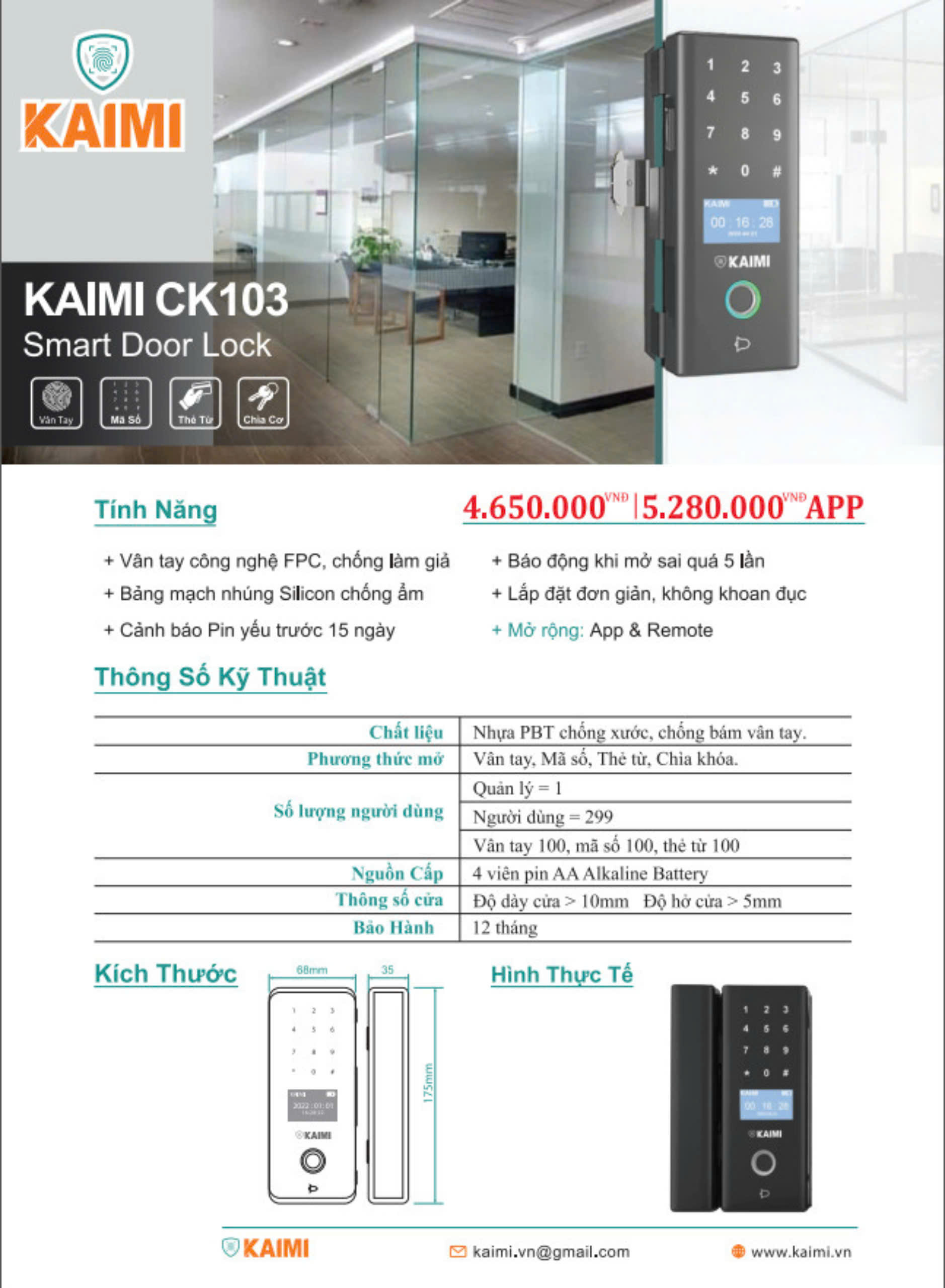 Khóa Thông Minh Cửa Kính CK103 đây là mẫu khóa cửa thông minh. sử dụng cho cửa kính cường lực bán chạy nhất hiện nay. Mẫu khóa cửa kính trang bị các tính năng mở cửa bằng: Vân tay, thẻ từ, mật khẩu, remote từ xa.