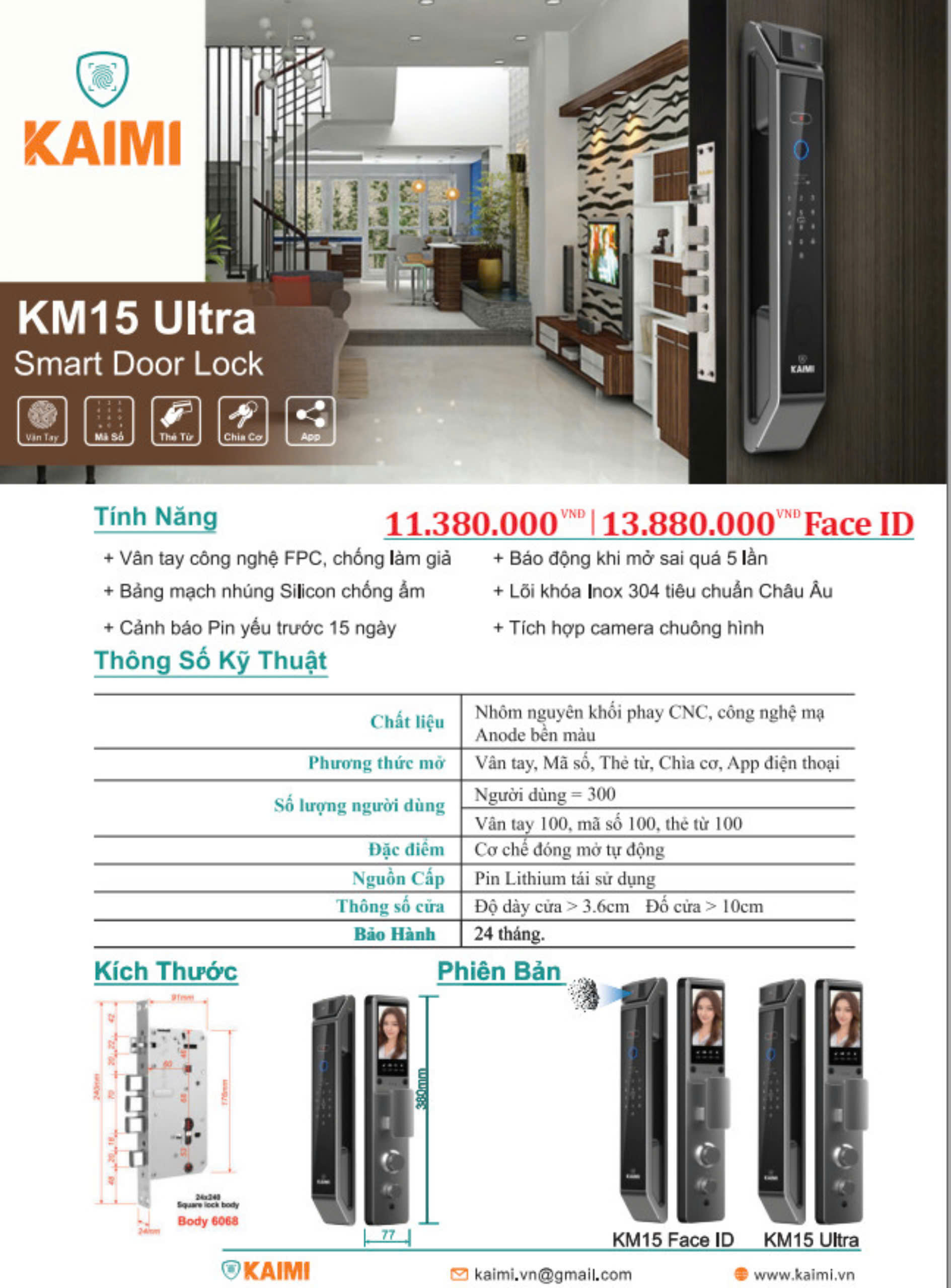 - Kích thước khóa: 6.5x77x365 mm (Dày, Rộng, cao)